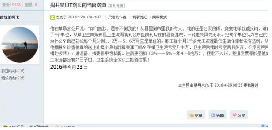近日,某论坛上的一篇名为《揭开淮阳县保健院院长田止学的当官密道》的帖子比较火热,网贴称,田某在十年里先后到4家医院任院长,并且都是因为职工告状才调走的,在哪任职哪亏损。